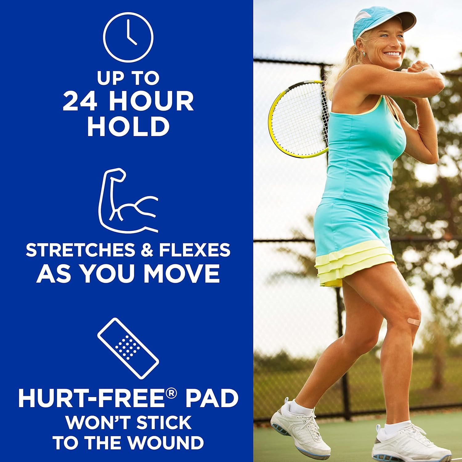 These Band-Aid Brand Flexible Fabric adhesive bandages stay on for up to 24 hours and feature a unique Hurt-Free Pad that won’t stick to the wound as they wick away blood and fluids, allowing for gentle, pain-free removal