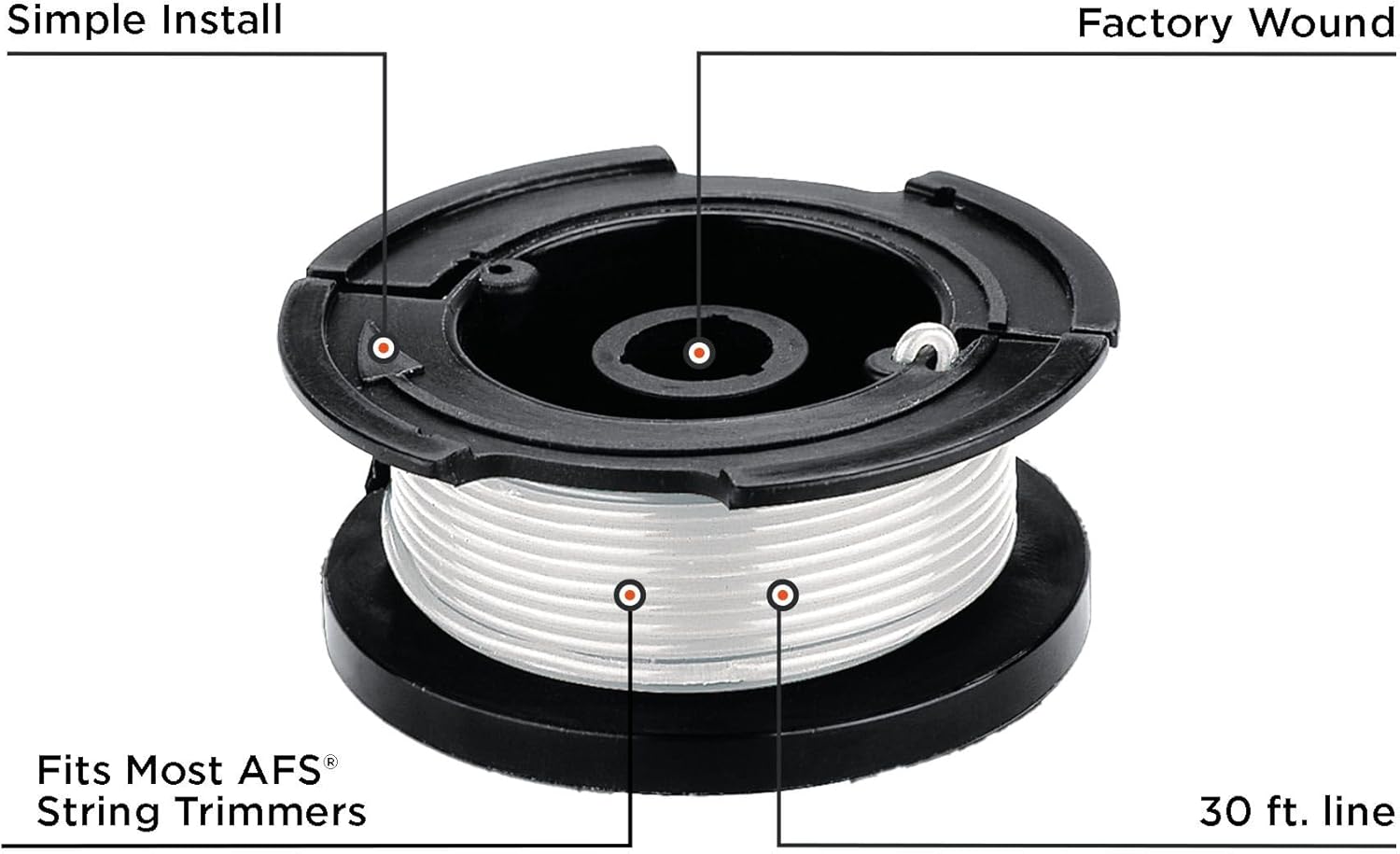 The BLACK+DECKER string trimmer Auto Feed System (AFS) Replacement Spool eases the tedious work of hand winding spools. Designed for use with Black & Decker auto feed string trimmers, the 30 foot factory wound replacement spool features a .065 inch diameter line utilizes centrifugal force to automatically feed the cutting string while eliminating bumps and hitches. Compatible with: BESTA510, BESTA512, BEASE620, CST1000, CST1200, CST2000, GH400, GH500, GH600, GH610, GH900, GH912, LST120, LST136, LST140, LST201, LST220, LST300, LST400, LST420, LST522, LST1018, LSTE522, LSTE523, LSTE525, NST1018, NST1024, NST1118, NST1810, NST2018, NST2118, ST7000, ST7200, ST7700, ST7701, ST8600, ST9000.