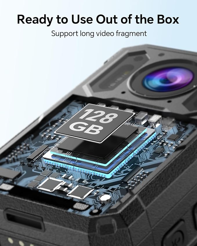 Built-in 128GB Memory: The KJ23PRO body camera comes with 128GB of built-in memory, offering ample storage for high-definition video and audio files without frequent changing memory cards,get ready to use when you get the wearable camera