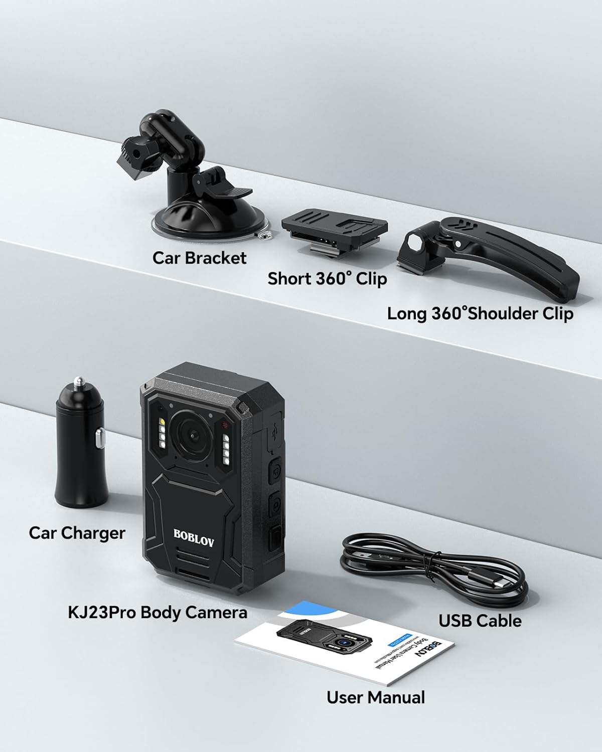 Comprehensive Kits: The KJ23Pro comes with a variety of accessories: KJ23Pro body camera x1, long 360° clip x1, short 360° clip x1, car charger x1, car bracket x1, USB-cable x1, user manual x1.These additions ensure versatile usage, from vehicle mounting(dash camera) to personal wear(daily shooting)for different scenarios.