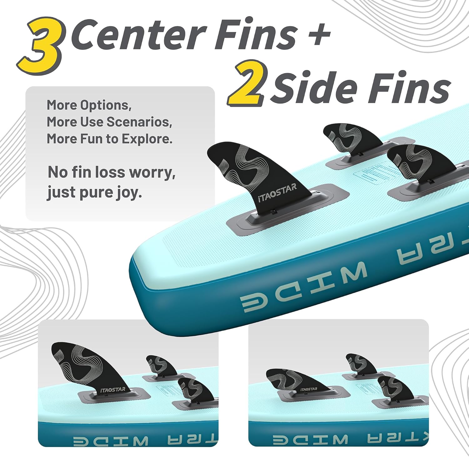 More Fun – Exclusively from iTAOSTAR, our five tailored fins (3 central + 2 side fins) adapt to various scenrios, offering diverse balance and zero fin-loss worries. Dive into personalized paddleboarding fun without limits
