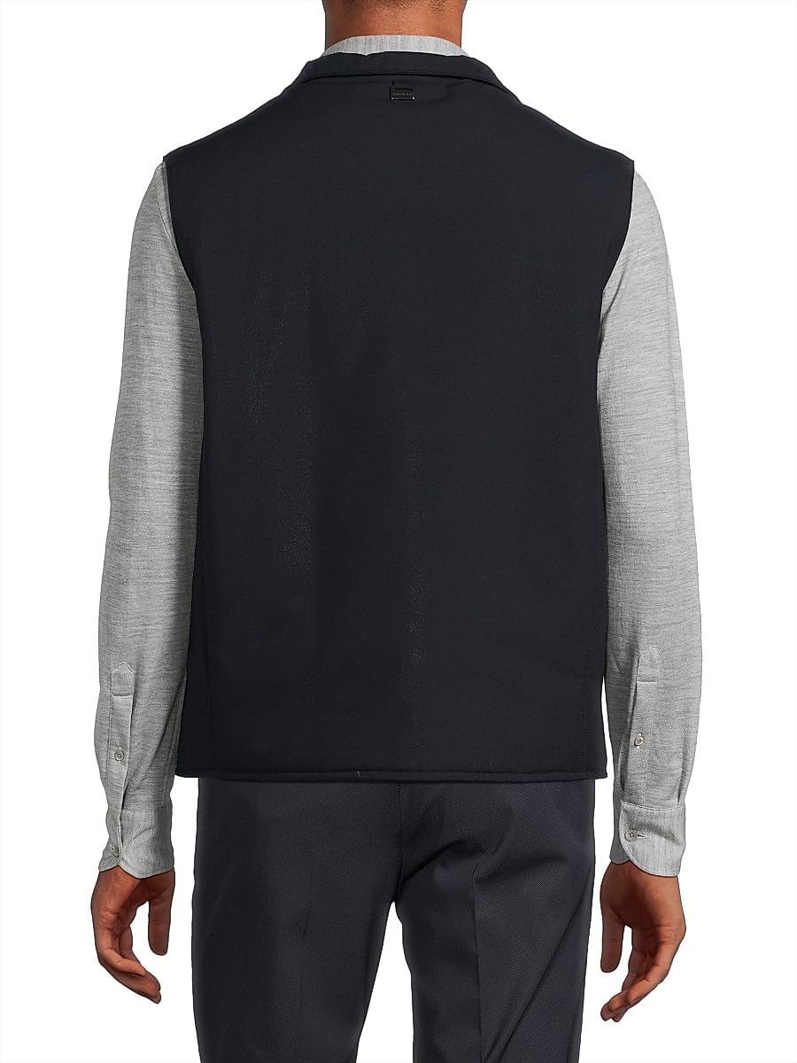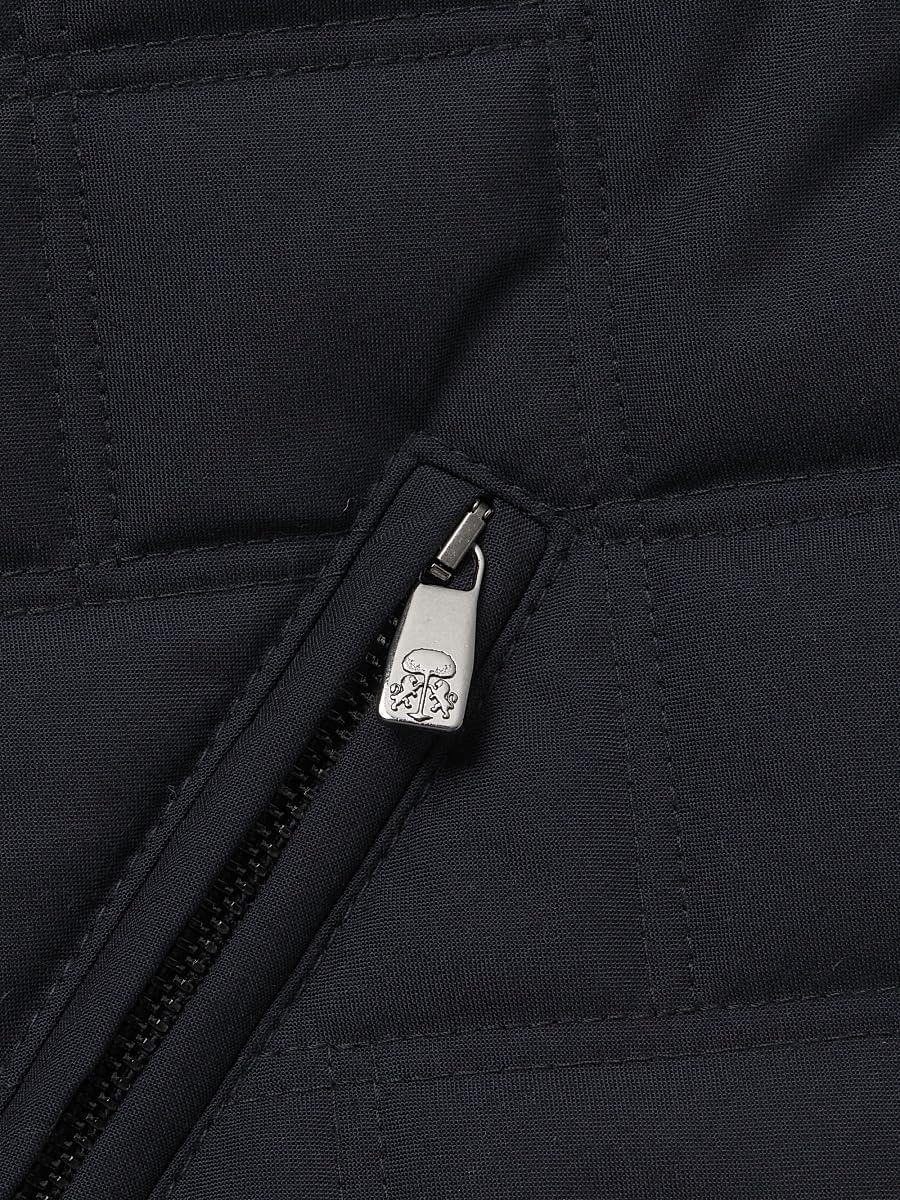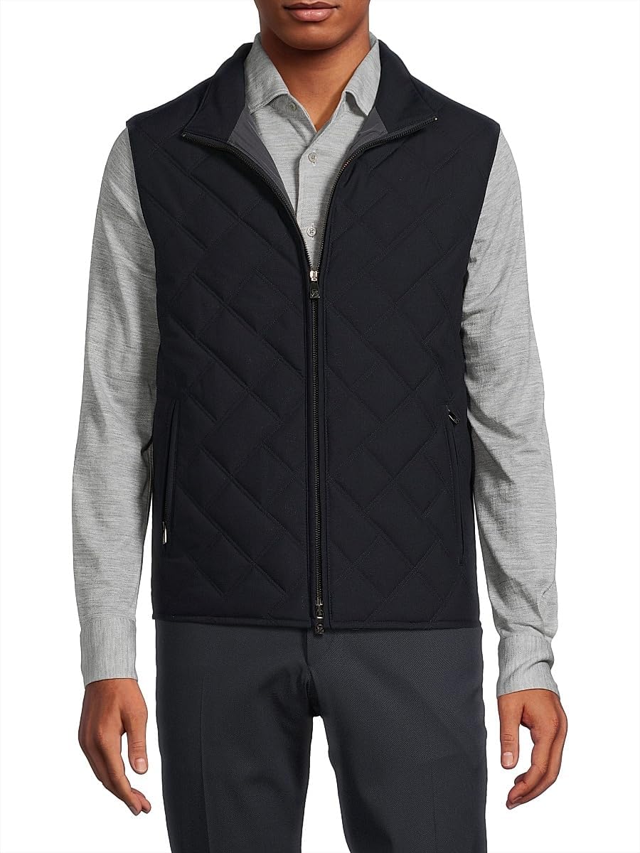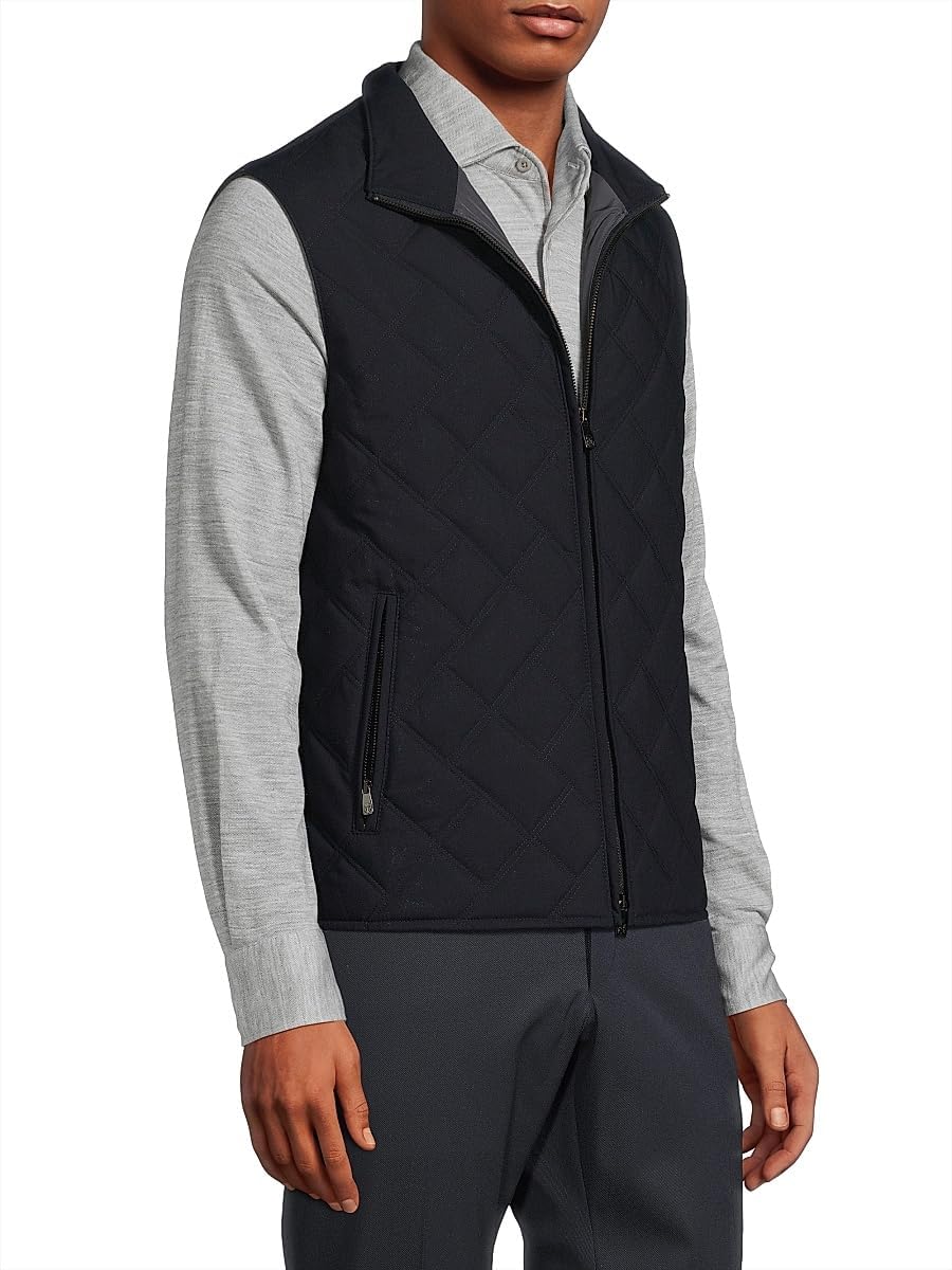 Quilting shapes Corneliani’s technical vest, designed with insulating warmth and a boxy fit.