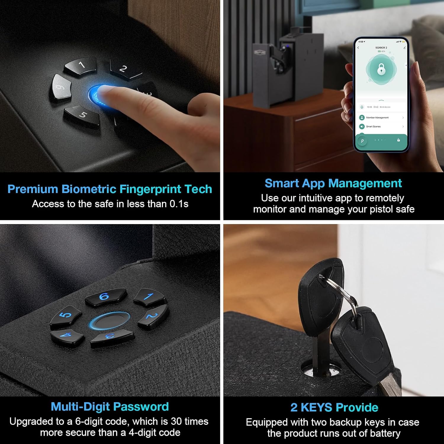 4 Security Entry Methods: The Slider Pistol Safe features 4 security entry methods to protect your guns and valuables: Smart App, Fingerprint,PIN and Backup Key. High-resolution fingerprint unlocking, you can open the gun safe in 0.1 seconds, up to 60 fingerprint can be stored. 4 unlocking options provide flexible and quick access to the pistol safe, saving time and ensuring safety in dangerous moments.
