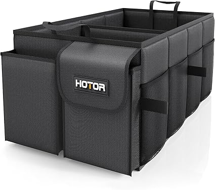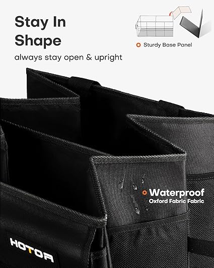 CONVENIENT ACCESS: HOTOR car trunk organizer for SUV is equipped with 2 compartments and 6 stretchy mesh pockets to make items easy to see and grab when needed. No more digging around a messy trunk to find what you need. Just grab and go.