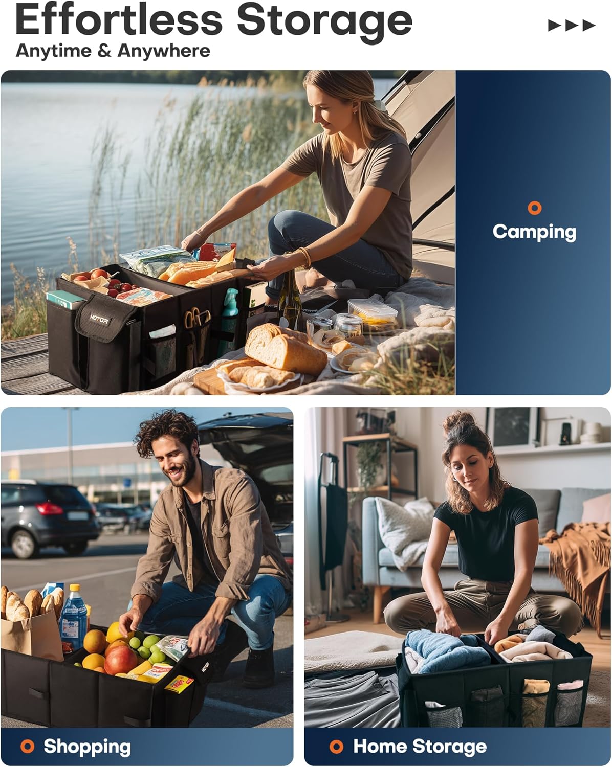 FLEXIBLE CONFIGURATION: Adjustable side Velcro strips allow you to fold the car storgae organizer fully or halfway to fit your storage needs. Just put it in the trunk, backseat, front seat, or wherever you want in the car.