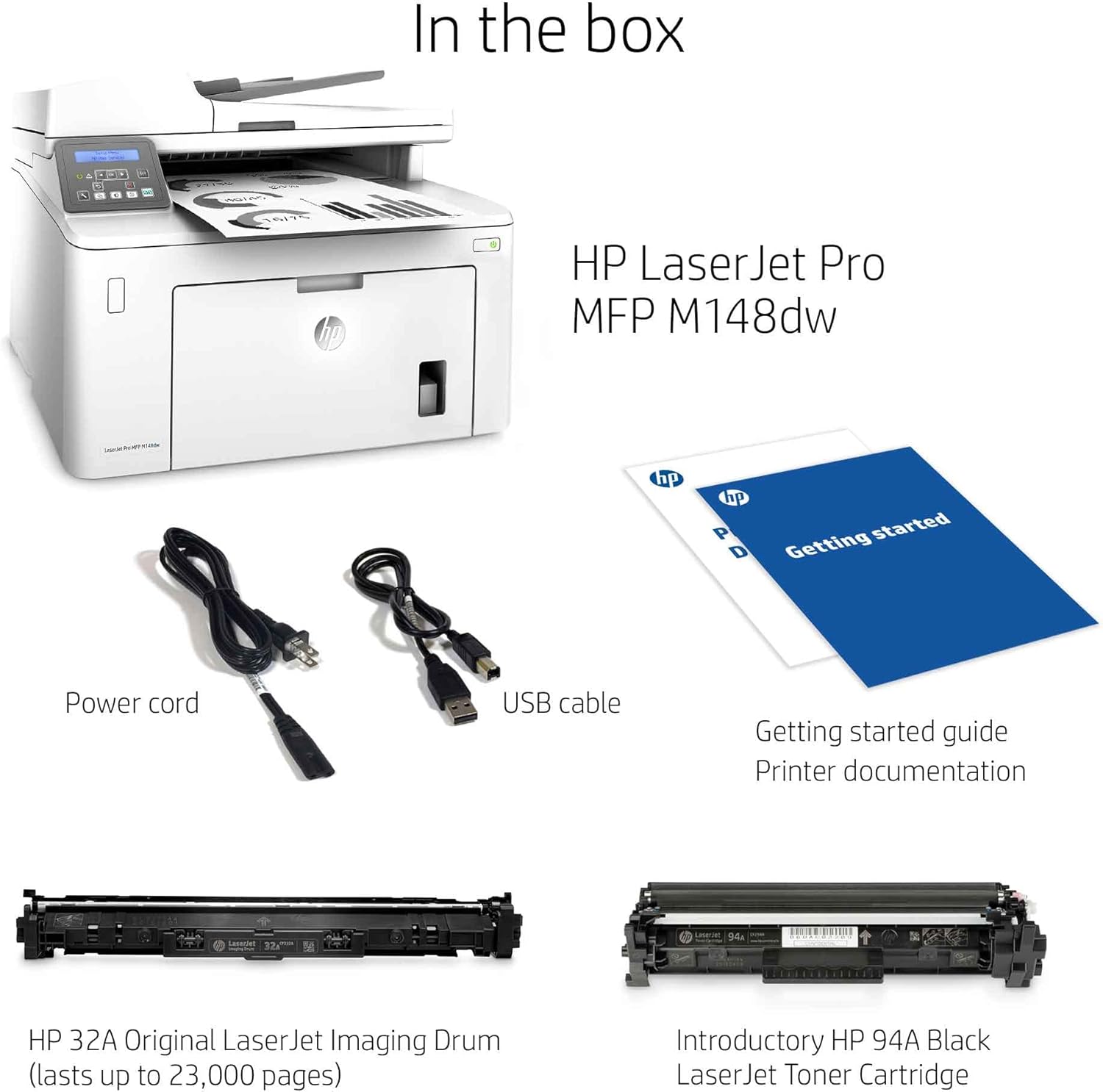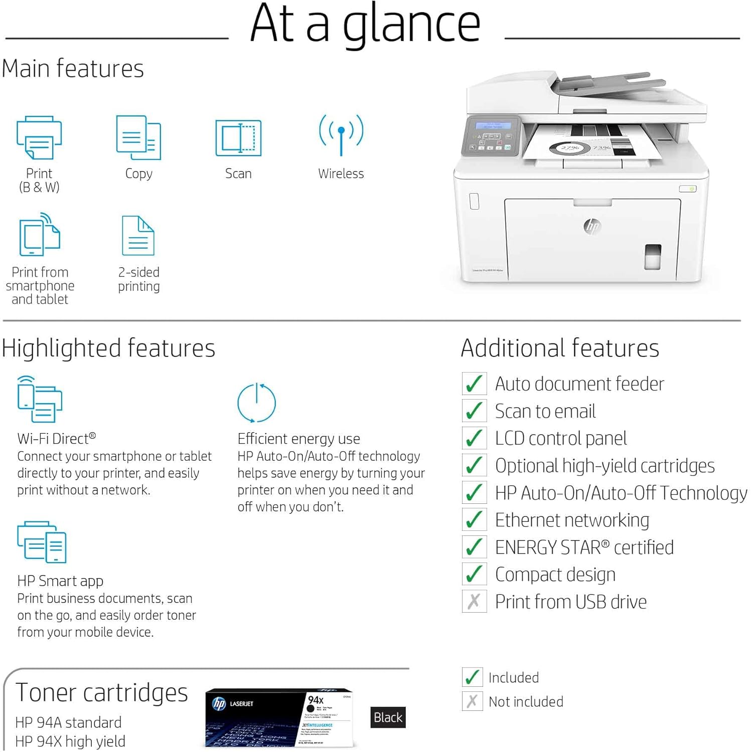 Sharp text and crisp graphics – Print 1,000 professional-quality pages with sharp, black text and rich, dimensional grayscales using this wireless laser printer with HP Original 94A/94X toner