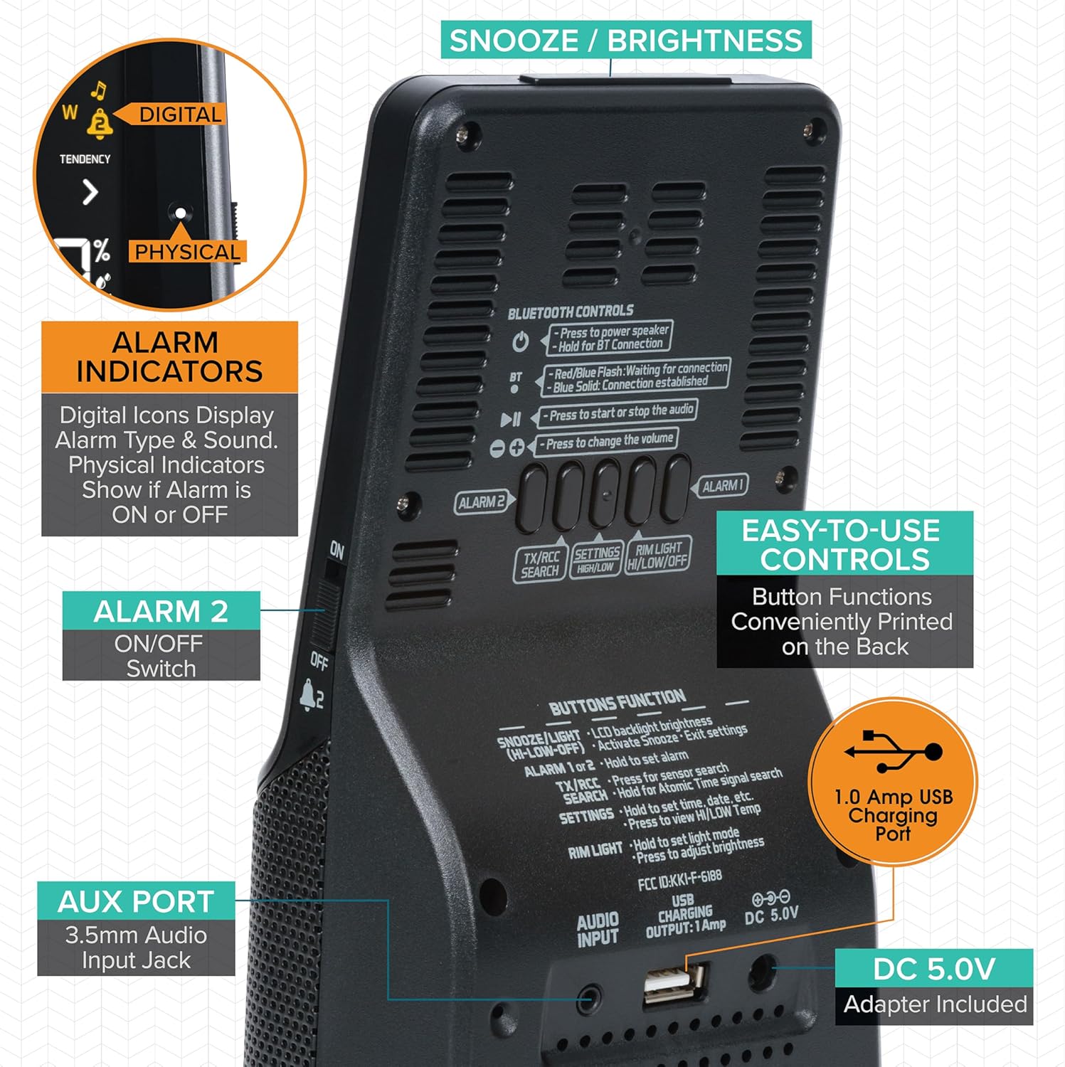 Clear and dynamic music plays your from your smartphone (or audio jack) using front panel buttons with its fast Bluetooth connection. Sleek, metallic mesh speaker and stylish case and displays the current temperatures (F/C) and humidity with colorful bright LCD indicating seconds, dual alarms and self setting atomic time and date. Charge a mobile device on the back of the clock using USB port (1 AMP max.)