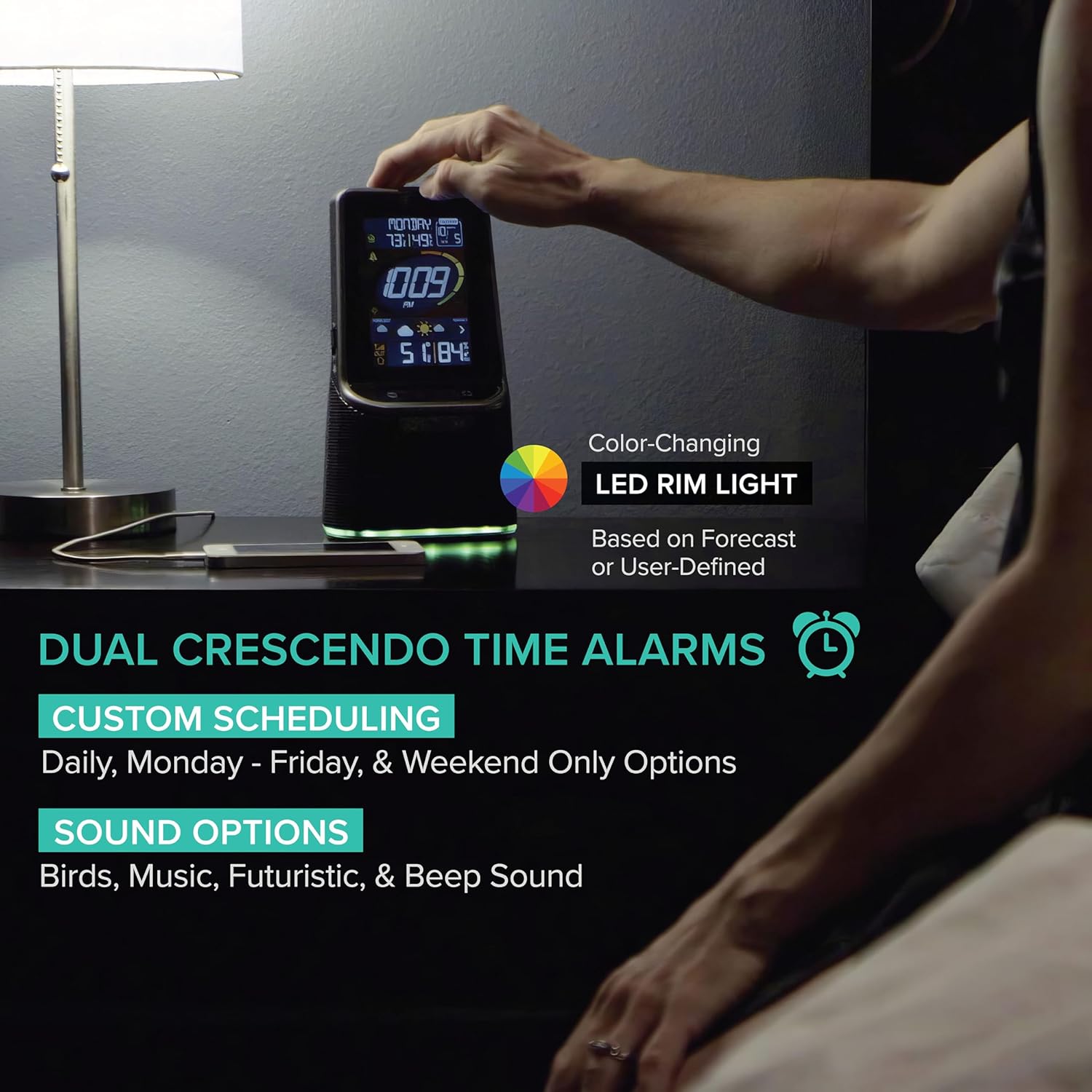 Multi-setting Dual alarms (Daily, Weekly, Weekends) and with optional sounds (birds, music, futuristic sound, beep)