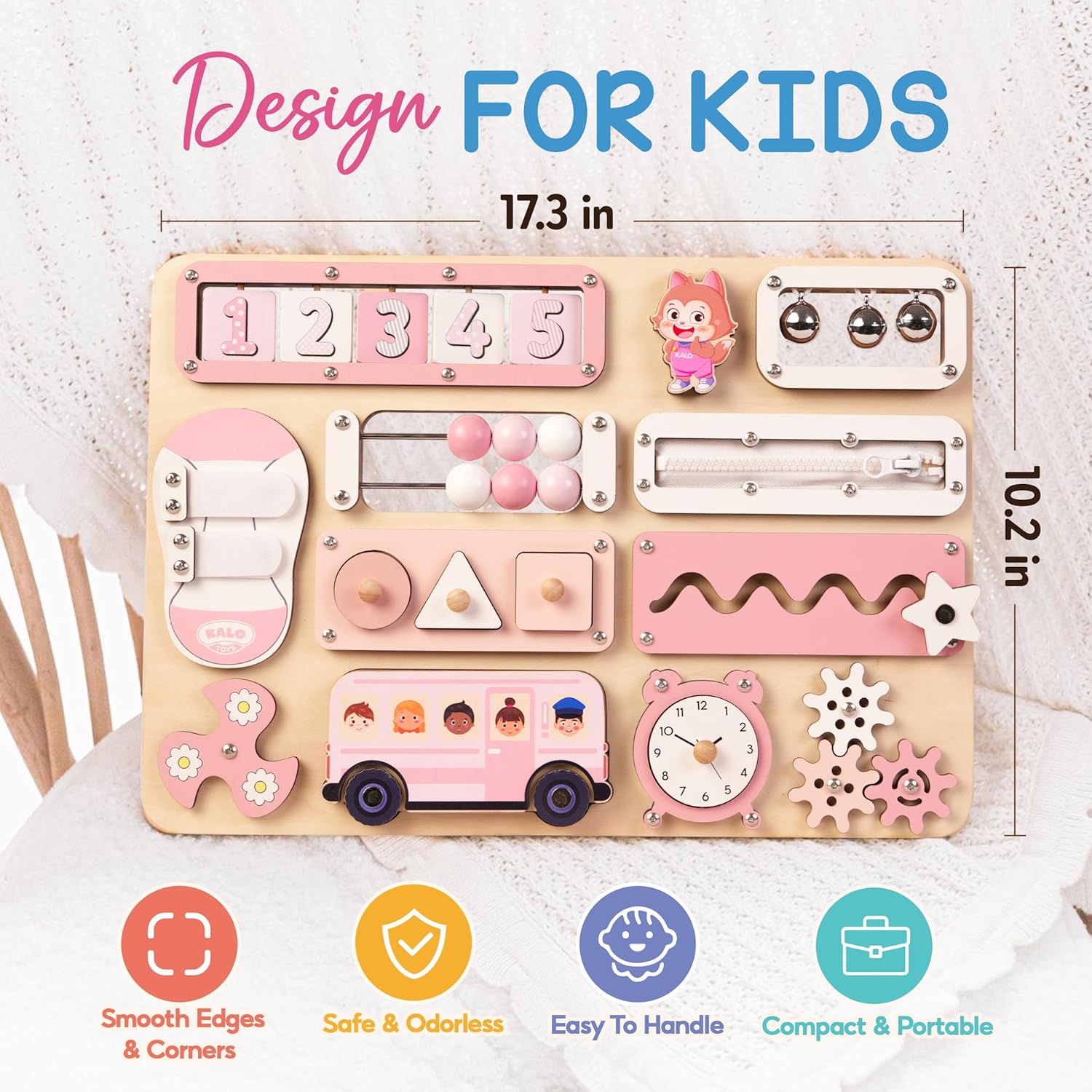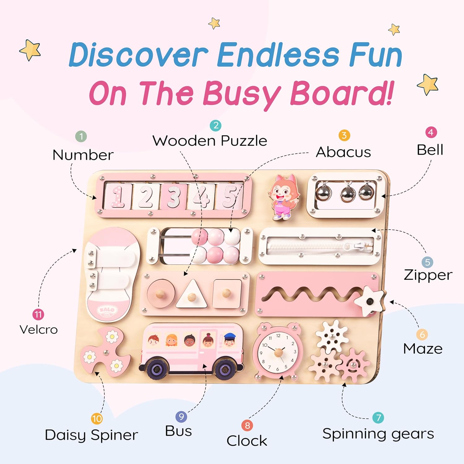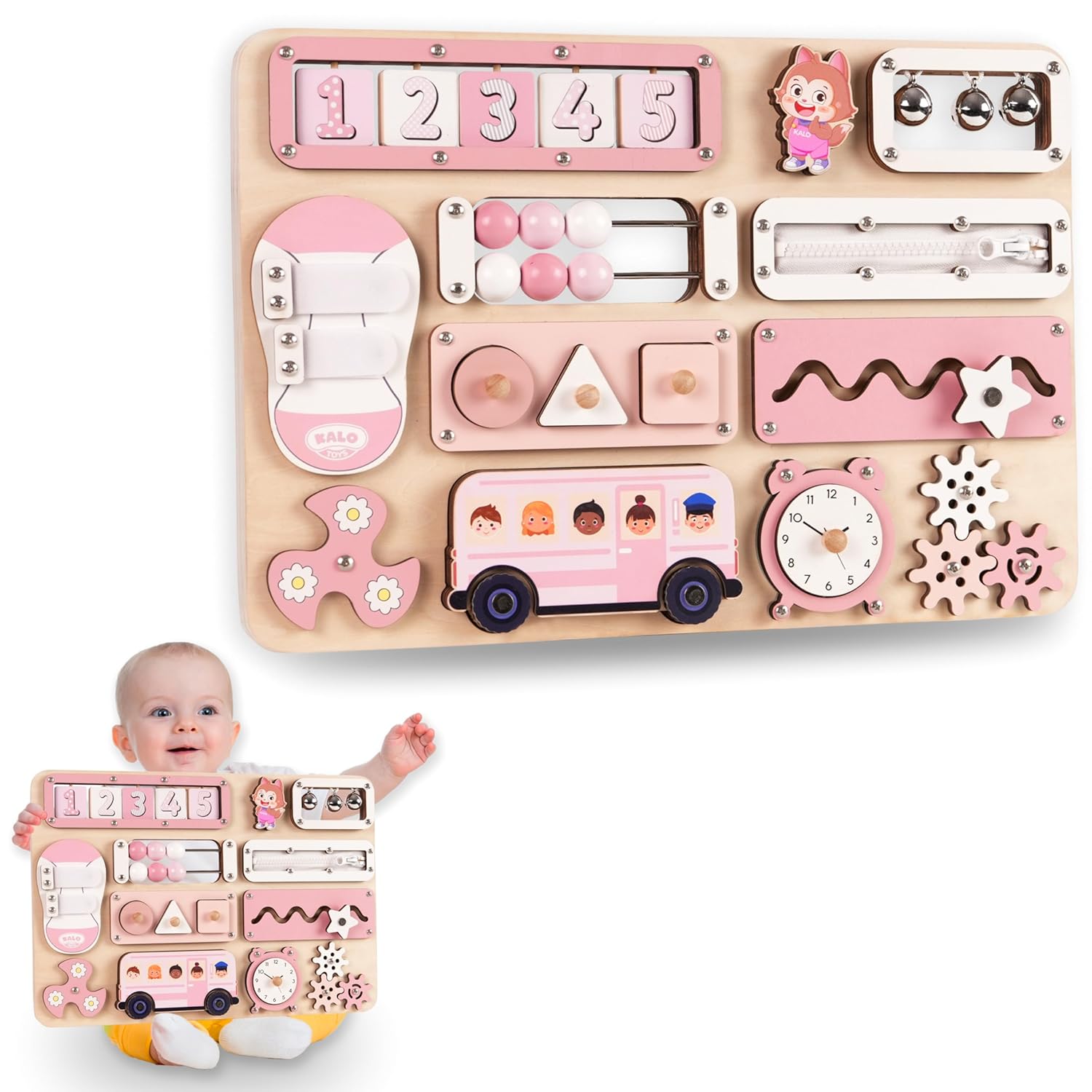 Toddler Montessori Busy Board Keep your little one engaged with many hands-on activities, including an abacus, Velcro, spinner, and name puzzle. Designed to promote fine motor skills, problem-solving, and sensory exploration.