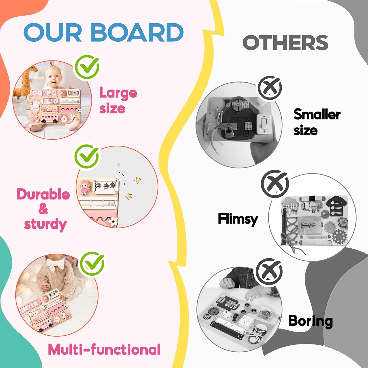 Customer Satisfaction Guarantee We stand by the quality of our products and continuously strive for improvement. Your purchase is backed by our guarantee, and we encourage you to reach out with any questions or concerns. Our commitment is to provide you with a satisfactory solution, ensuring your experience with our baby busy board is nothing short of delightful.