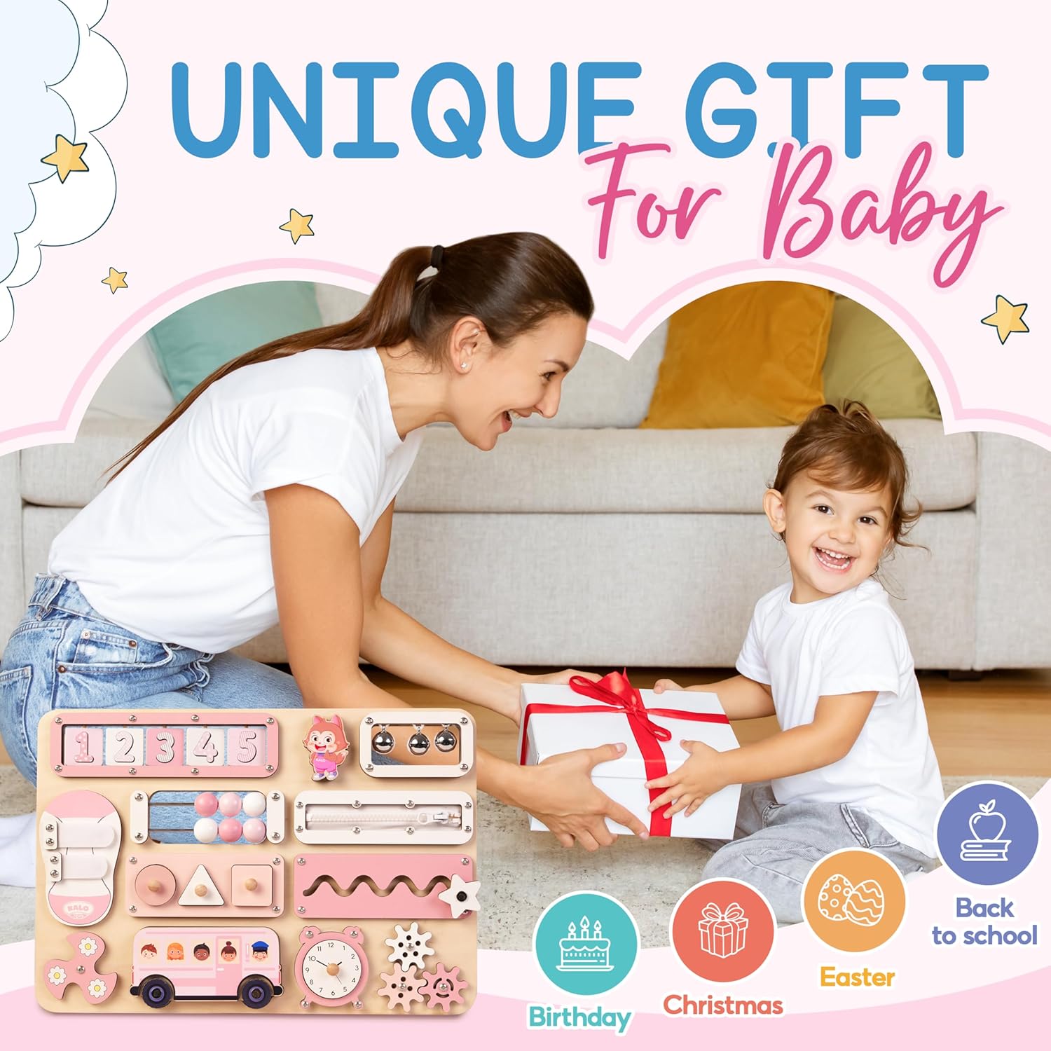 Versatile and Thoughtful Gifts These montessori busy board make perfect and unique gifts for various occasions, including baby showers, birthdays, Easter, baby valentines, Christmas, and New Years. With thoughtful engraving and free carton packaging, it’s a heartfelt present that leaves a lasting impression.