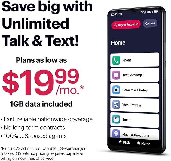 Simple Cell Phone: This is our simplest smartphone yet, with a larger 6.7” screen, easy-to-navigate menu, voice calling, real-time call captioning and Urgent Response button