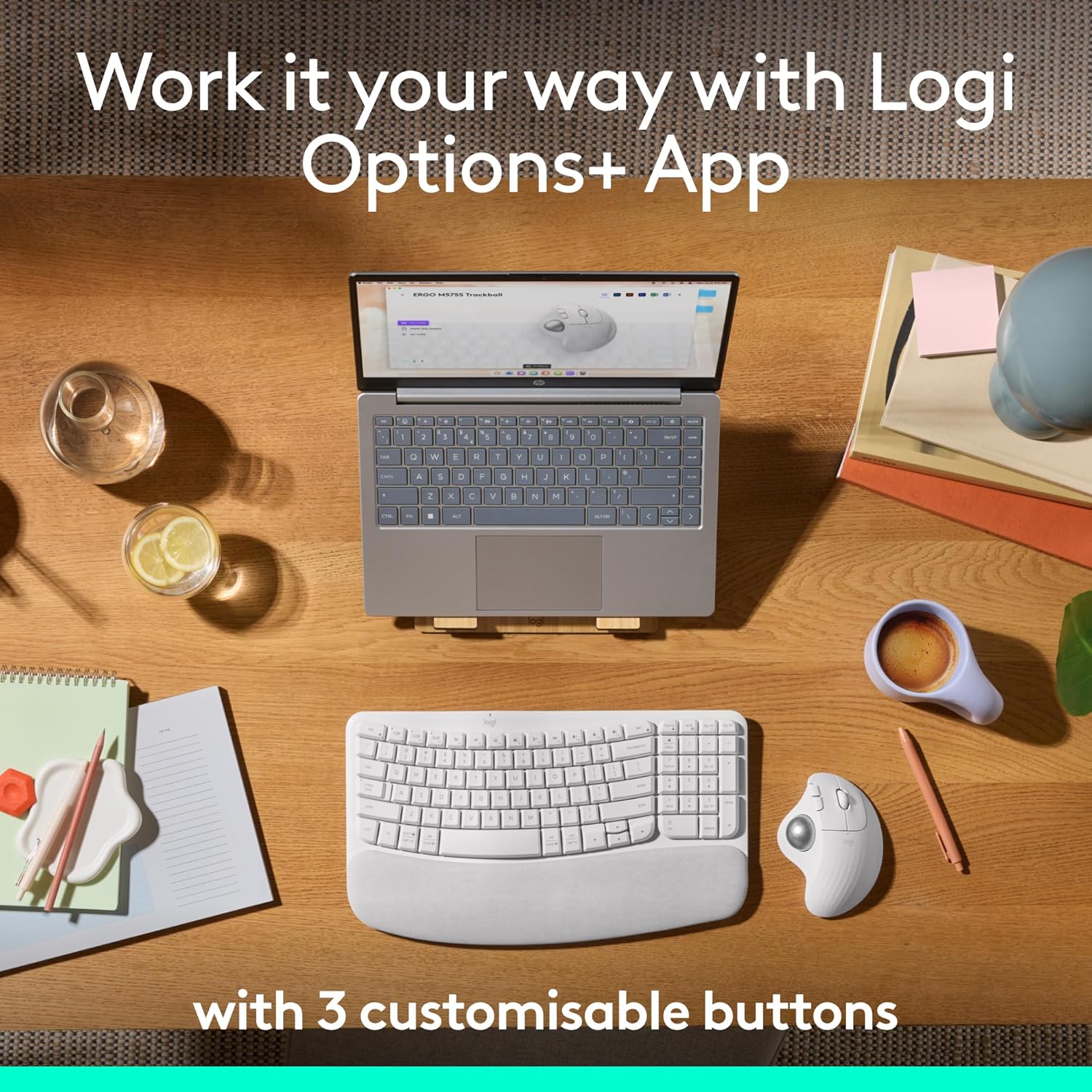 Ergo M575S offers smooth thumb control and precise tracking. For more control, adjust the cursor speed or assign time-saving shortcuts on the 3 customizable buttons using the Logi Option+App**.