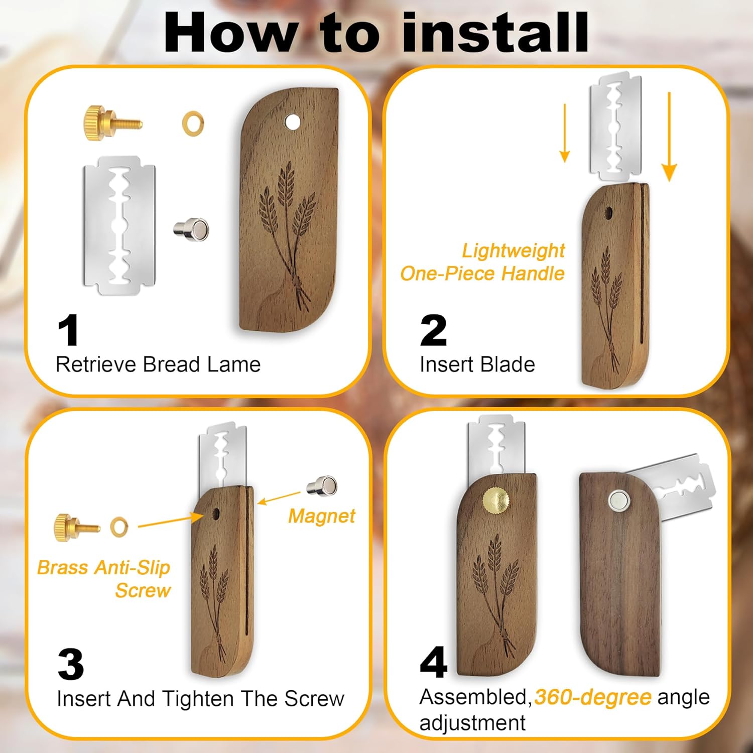 [Packaging List] The bread scoring tool comes with 10 razor blades, 1 portable storage bag, 1 black walnut handle, and 1 steel plate with adhesive backing
