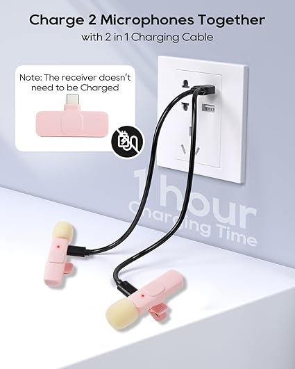 2 in 1 Fast Charging: With 2 type c heads, the charging cable can full charge 2 microphones together in 1 hour. Using 2 microphones in turn when 1 of them runs out of the battery to get 4h+4h Working Time. Note: The receiver doesn’t need to be Charged