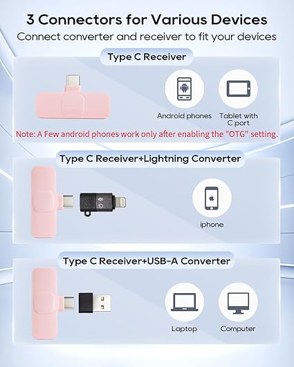 3 Connectors for Various Devices: Type C receiver is for android phones, tablet with C port. (Note: For few android phones, turn on “OTG” if it doesn’t work.) Receiver with lightning converter is for iphone. Receiver with USB-A converter is for computer