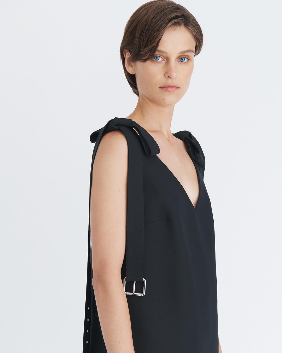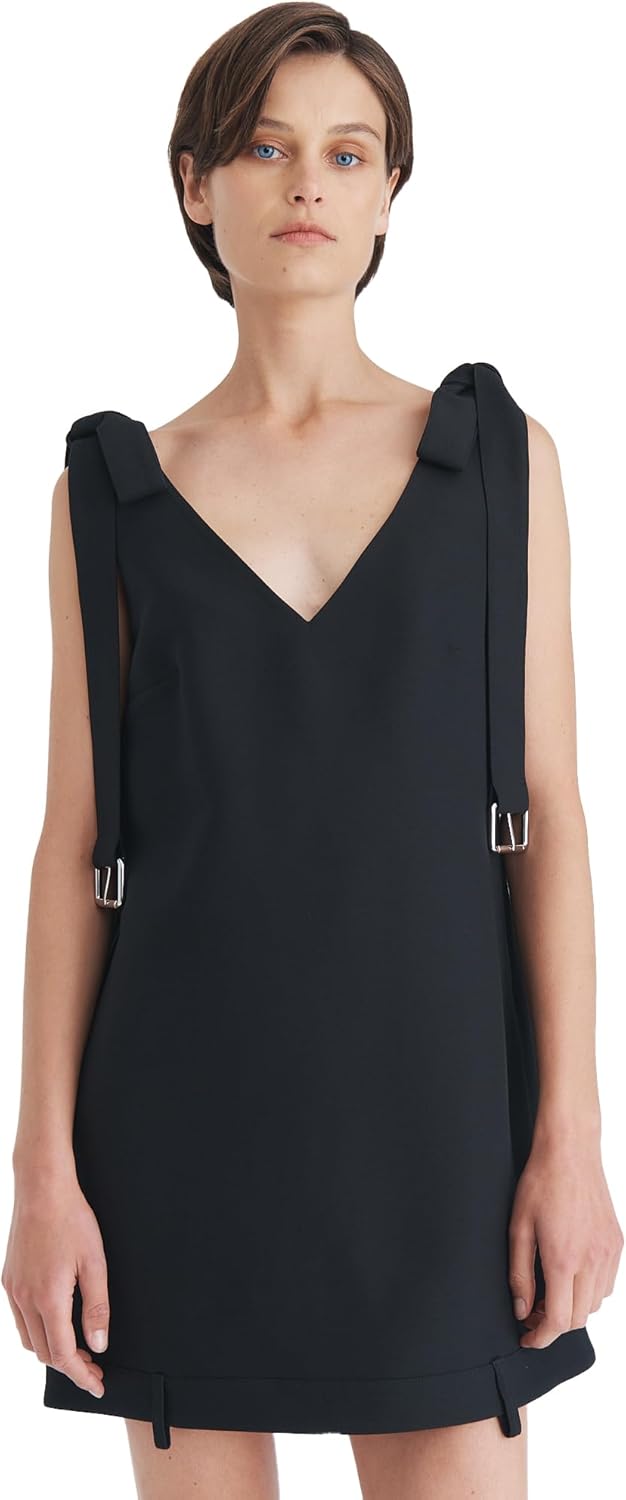 Mini dress with a deep V-neckline and adjustable tie shoulder straps with silver buckle accents.