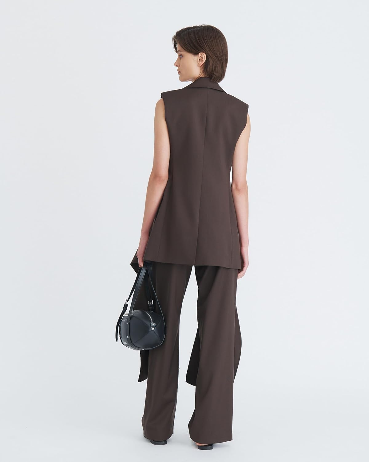 A reimagined tailored layer—this Sleeveless Fly-Away Jacket plays with proportion and movement, merging suiting structure with bold deconstruction.