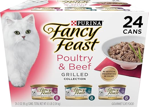 Give your cat more of the savory flavors she loves with Purina Fancy Feast Grilled Poultry and Beef Collection wet cat food. Turkey, chicken and beef recipes offer a delicious taste, and the slow-cooked, tender cuts deliver a tempting texture she’s sure to adore. Each variety in this collection features a savory gravy to balance out the recipes, and high-quality ingredients give you added peace of mind every time you fill her dish. Give her an exceptional level of taste at mealtime, and watch as she delights in every meaty morsel. Essential vitamins and minerals in every serving support her overall health and wellness, helping you to feel good about the foods you put in her dish each day. Let your feline friend know you pay attention to her cravings for delectable meals every time you open a can from this Fancy Feast gourmet canned cat food variety pack. When you place Purina wet food for cats into your Amazon.com shopping cart, you’re a bit closer to giving her the tastes she loves.