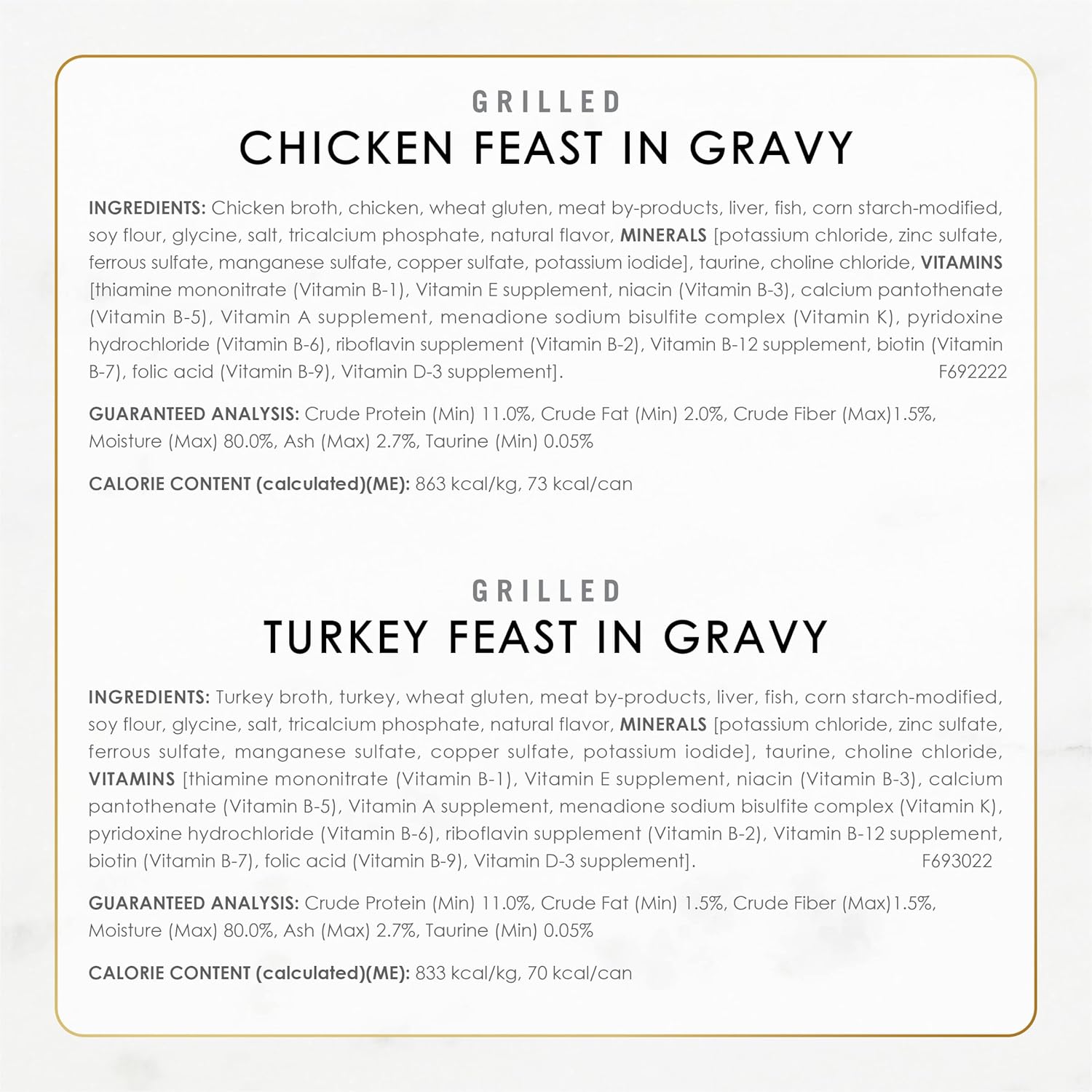 Chicken Feast In Gravy: Chicken Broth, Chicken, Liver, Wheat Gluten, Meat By-Products, Corn Starch-Modified, Artificial and Natural Flavors, Salt, Tricalcium Phosphate, Soy Protein Concentrate, Added Color, Potassium Chloride, Taurine, Magnesium Sulfate, Mono and Dicalcium Phosphate, Choline Chloride, Thiamine Mononitrate, Vitamin E Supplement, Zinc Sulfate, Ferrous Sulfate, Niacin, Calcium Pantothenate, Vitamin A Supplement, Copper Sulfate, Menadione Sodium Bisulfite Complex (Source of Vitamin K Activity), Manganese Sulfate, Pyridoxine Hydrochloride, Riboflavin Supplement, Vitamin B-12 Supplement, Biotin, Folic Acid, Vitamin D-3 Supplement, Potassium Iodide. C-6922. Turkey Feast In Gravy: Turkey Broth, Turkey, Potassium Iodide. C-6930. Beef Feast In Gravy: Meat Broth, Beef, Potassium Iodide. C-6920.