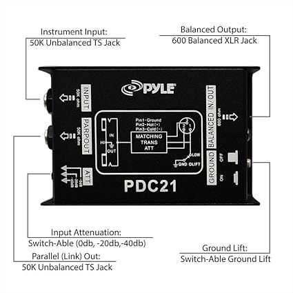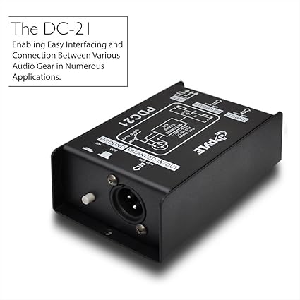 Pylepro model: Pdc211/4” Instrument to balanced & Unbalance1/4” Instrument to balanced & unbalanced (1/4”/XLR) direct box construction: All steel chassis ground lift: switch-able ground lift balanced output: 600 balanced XLR jack instrument input: 50K unbalanced TS jack parallel (link) out: 50K unbalanced TS jack input attenuation: switch-able (0dB, -20dB,-40dB) dimension: 4.72” X 3.01” X 1.77”The dc-21 is one of the most useful and versatile tools available indispensable in enabling easy interfacing and connection between various audio gear in numerous applications.Pyle PDC21 is a necessity if you are looking for the biggest quality of sound, with low distortion, noise, and eliminate ground loops. A DI unit, DI box, Direct box, Direct input, direct injection or simply DI is an electronic device that connects a high impedance, line level, unbalanced output signal to a low impedance mic level balanced input, usually via XLR connector. Dis are frequently used to connect an electric guitar or electric bass to a mixing console’s microphone input. The DI performs level matching, balancing, and either active buffering or passive impedance bridging to minimize noise, distortion, and ground loops. Dis do not perform impedance matching. Pyle has been in business for over 35 years, and their manufacturing experience and expertise is easy to see – and hear.