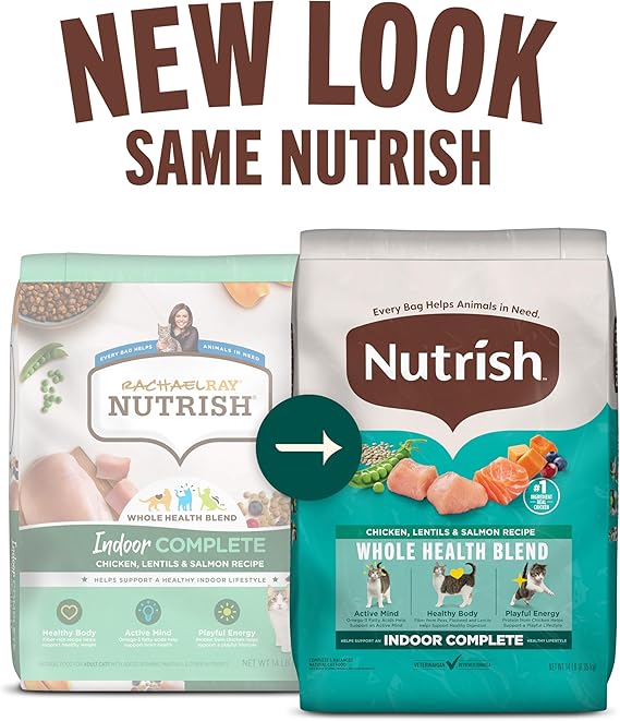 Rachael Ray Nutrish Indoor Complete Chicken with Lentils & Salmon Recipe is a dry cat food blend made with simple, natural ingredients with added vitamins, minerals and nutrients to meet the dietary needs of indoor cats. This dry cat food includes real U.S. farm-raised chicken as the #1 ingredient, real salmon, wholesome lentils, and a unique Superfood Blend that’s packed with essential amino acids, vitamins, and minerals to help support your cat’s healthy lifestyle. Rachael Ray Nutrish dry cat food is a delicious way for your fur family to enjoy a homestyle meal. Made just-right size, the dry kibble is easy to chew and swallow without sacrificing the crisp, crunchy texture and big flavor cats crave. Using only the highest quality ingredients and never any poultry by-product meals or fillers, ground corn, added wheat or soy ingredients, artificial flavors or preservatives, you can feel as good serving this cat food as they do eating it up! And better yet, a portion of your dry cat food purchase will help support The Rachael Ray Foundation, which helps animals in need get the food, medical supplies, treatments, and more that they may need.