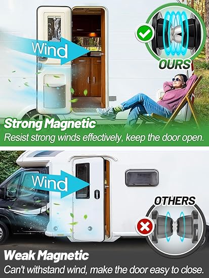 Versatile Application: This magnetic door stopper is suitable for various vehicles such as RVs, campers, and travel trailers, and can be used for entrance doors, cabinet doors, bathroom doors, and storage room doors of RVs, keeping doors open, maintaining air circulation, freeing hands when moving items, and making your RV travel more convenient and worry-free.
