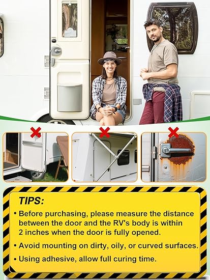 Product Contents: You will receive 1 magnetic door stopper kit, 2 double-sided adhesive tapes, 2 expansion tubes, and 4 screws. Everything you need is included, making installation convenient and quick. Before purchasing, please measure the distance between the door and the RV’s body is within 2″ when the door is fully opened.