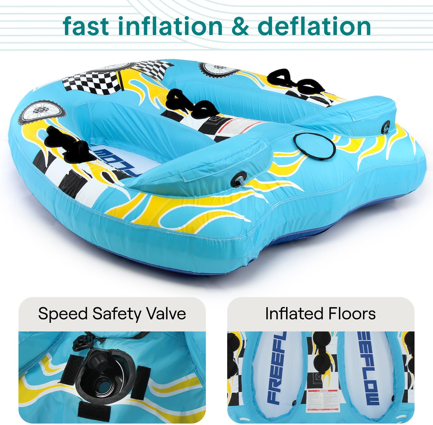 SAFETY VALVE: Features speed safety valve for fast and easy inflation and deflation, gets your towable tube ready in no time! Can be rolled up for easy storage and transport. Designed w/ heavy-duty PVC bladders and zippers w/ full-size EVA foam pads