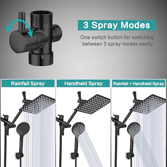 Amazing Shower Head Combo: It comes 8’’ large square rainfall showerhead, 4.5” matte black face 9 spray settings handheld shower, 5ft stainless steel hose, water flow regulator, 3-way diverter, strong suction cup shower bracket, Teflon tape, washers, installation manual and warranty.[Max flow rate: 1.75gpm], [Manufacturer: Tudoccy], [CEC registration code: SUB99575], [Model: SHP-HS]