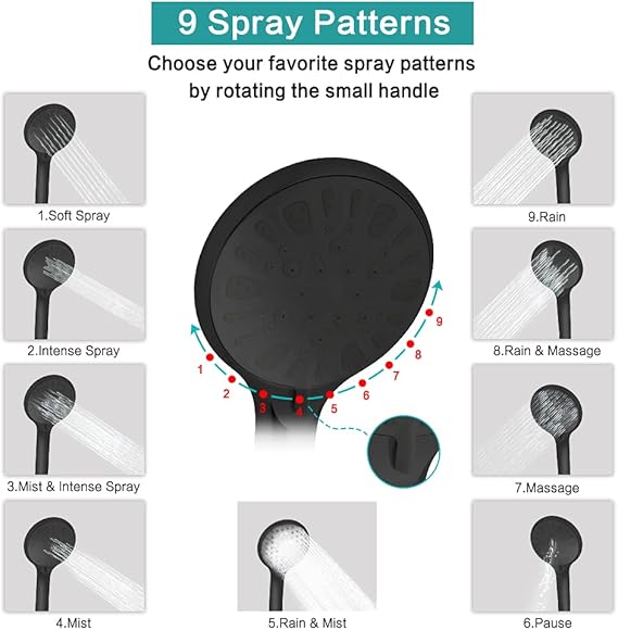 9 Settings Handheld Shower Head: Its nozzle adopts Tpr and high-level Abs. Creates a pressure-increasing stream and delivers water at a higher velocity to compensate for low water pressure situations. 9 spray patterns that make a pressure-boosting effect for the ultimate shower experience even at low pressure. It is ideal for bathing kids, washing pets and cleaning applications, etc