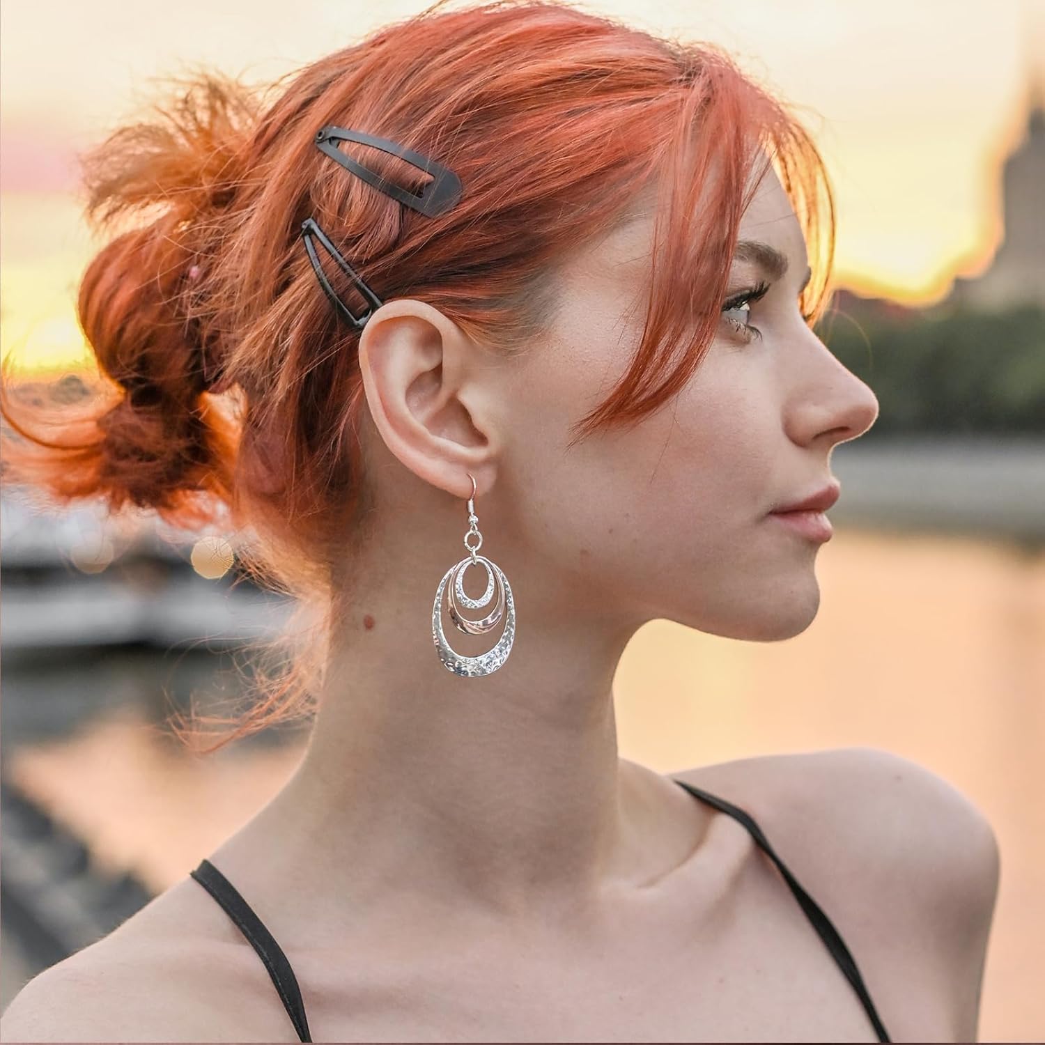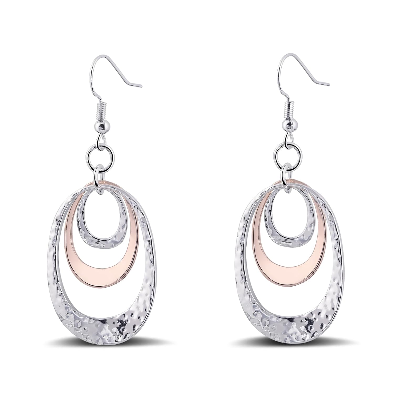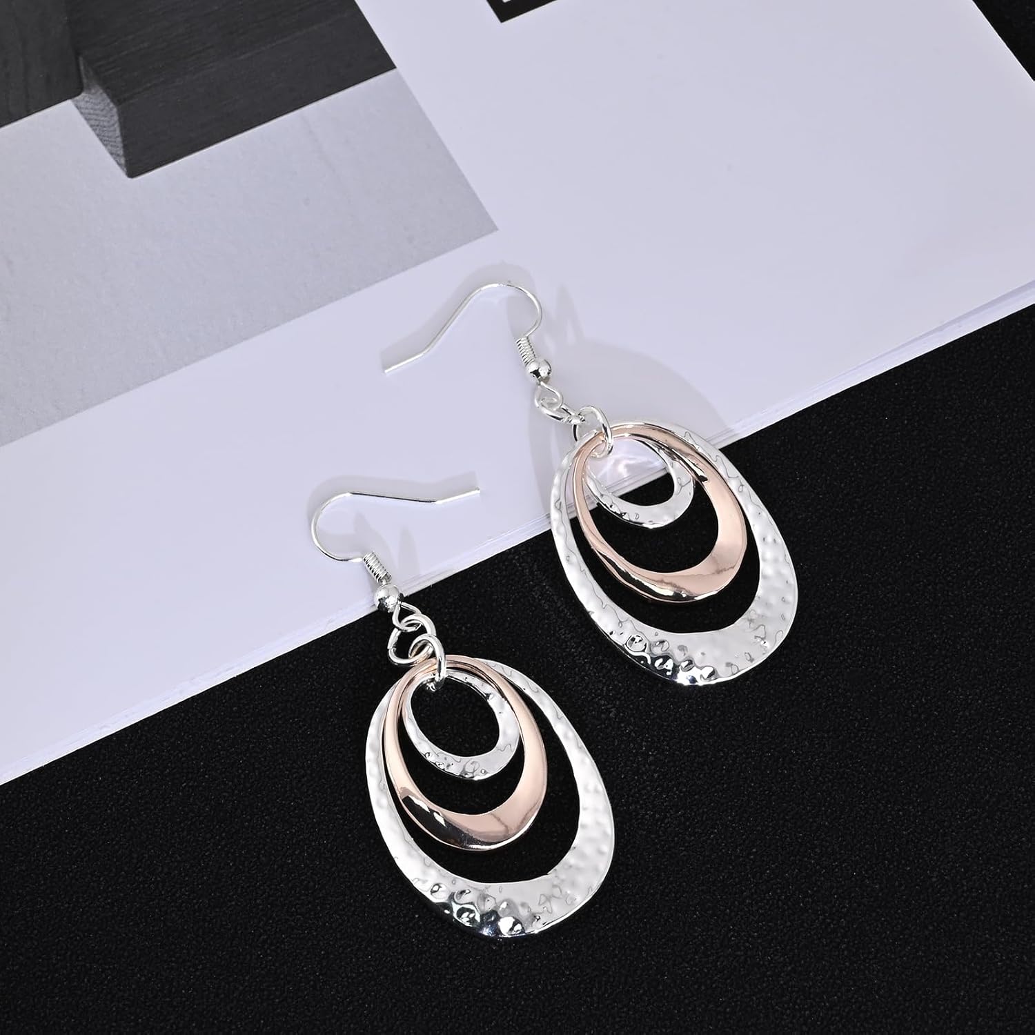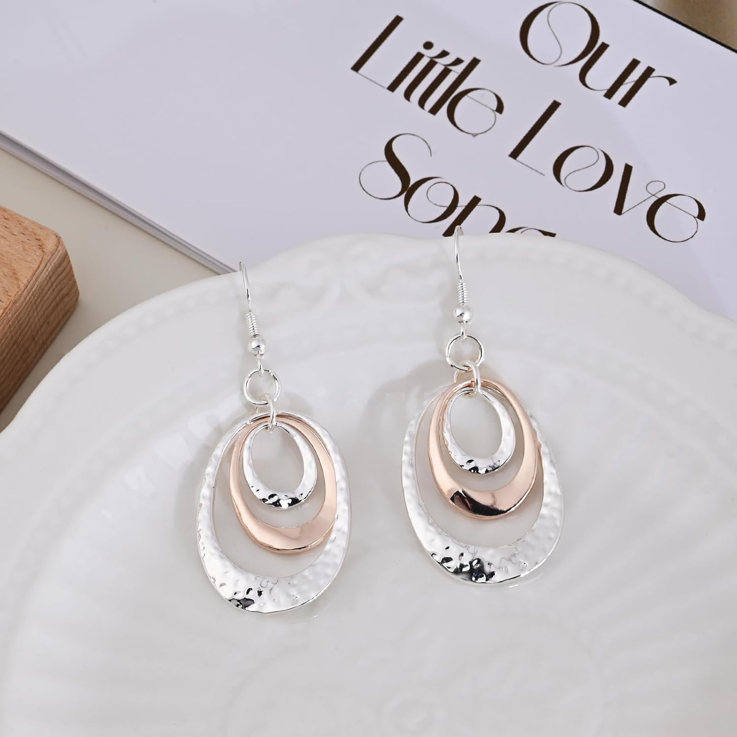 [Bohemian Dangle Earrings] These silver and rose gold two tone earrings adopt a cascading three-oval design. The circles symbolize natural elements like sun halos, planets, and tree rings. Three simple ovals create unique boho earrings perfect trendy supplements to daily jewelry