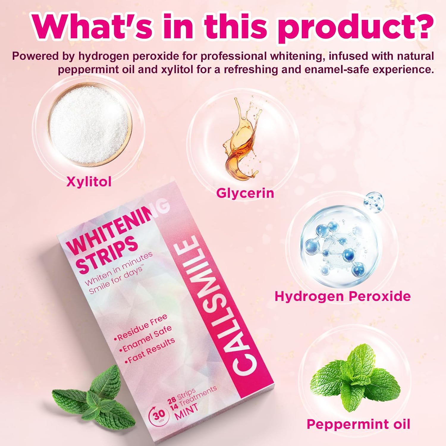 Gentle & Fast Whitening Our whitening strips are formulated with carefully selected gentle ingredients. Made with enamel-safe components like peppermint oil and hydrogen peroxide, they deliver effective whitening without damaging enamel, making them safe and comfortable for sensitive users