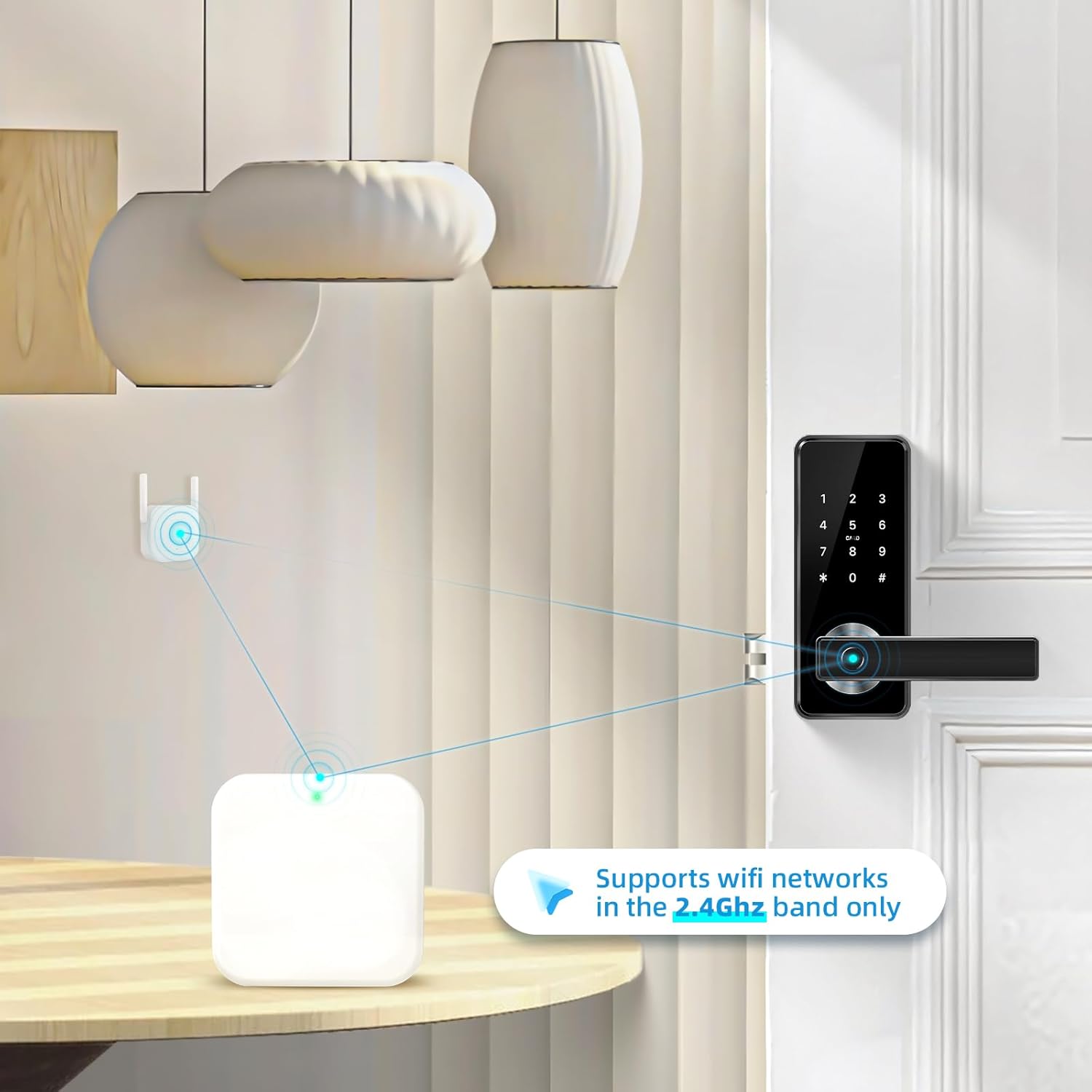 Coverage: It is recommended that the distance between the gateway and the smart lock be no more than 32 feet (10 meters), otherwise the connectivity of the gateway will be affected. Please note that when adding a gateway, your smartphone and the gateway must be connected to the same Wi-Fi network. (Only 2.4Ghz network can be connected)