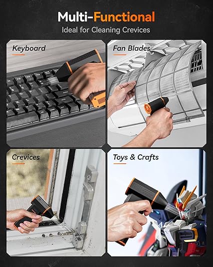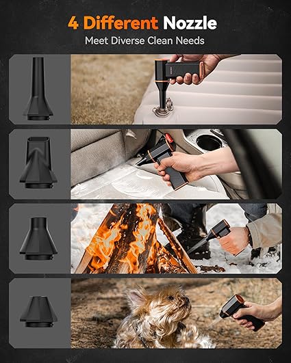 Wide Application: WOLFBOX MF50 electric air duster comes with 4 nozzles, making it suitable for a variety of scenes, such as pc, keyboards, or other electronic devices. It also serves well for home clean and car duster.