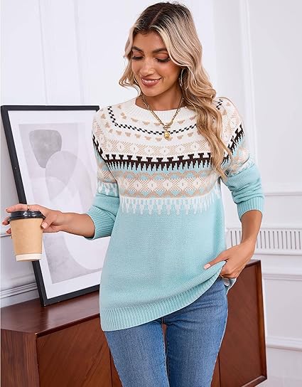 Women’s Fair Isle Pattern Sweater Cozy Knit Crewneck Pullover for Winter